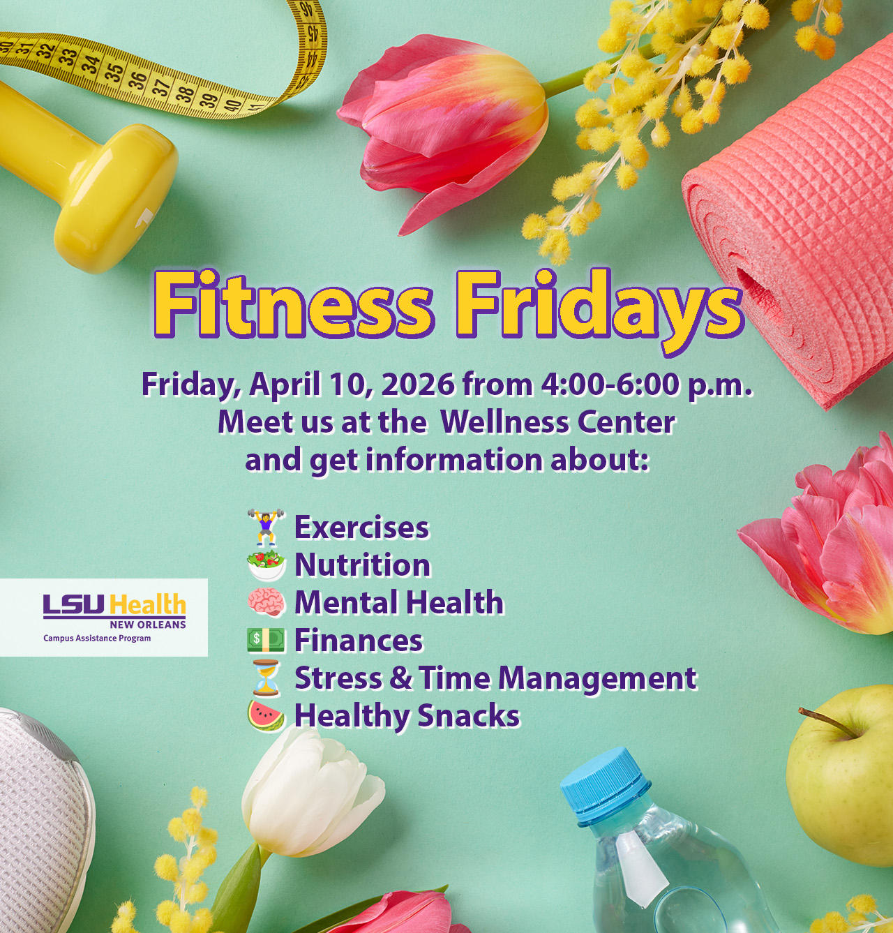 Join us on Friday, April 10, 2026, from 4:00β6:00 pm at the Wellness Center for an afternoon focused on your well-being!